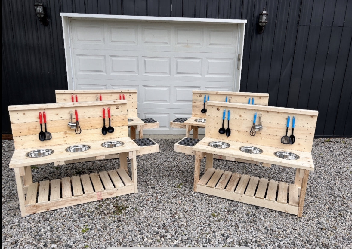 Take outdoor play to new heights with our Large Mud Kitchen, now featuring a muffin tin add-on for even more culinary creativity! Crafted from durable, sustainably sourced spruce wood, this kitchen is built to last and withstand years of outdoor fun. The kitchen includes three stainless steel bowls, five utensils, a set of measuring cups, and the muffin tin add-on for added baking adventures. With a generous size of 58" long, 40" tall, and 22" deep, it provides ample space for multiple children to play together, encouraging teamwork, creativity, and skill development. This spacious and functional kitchen makes a perfect addition to any outdoor play area, fostering imaginative cooking, role-play, and hands-on learning.